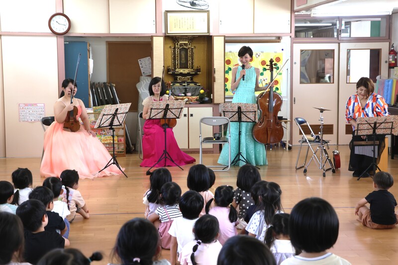 バイオリン・ビオラ・チェロの弦楽器とパーカッションの打楽器を加えて『トルコ行進曲』や『さんぽ』『崖の上のポニョ』などを演奏して頂きました(^^♪
