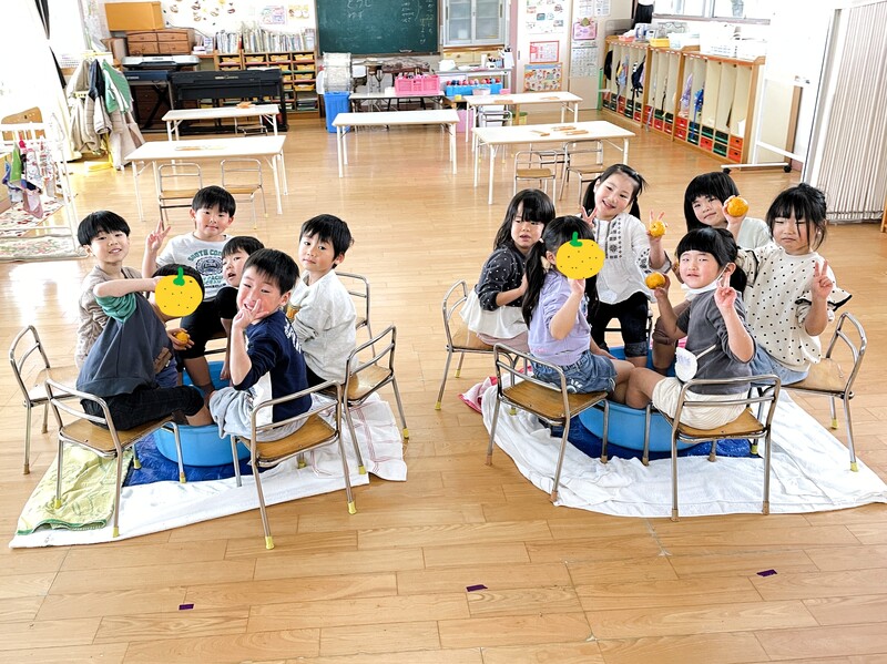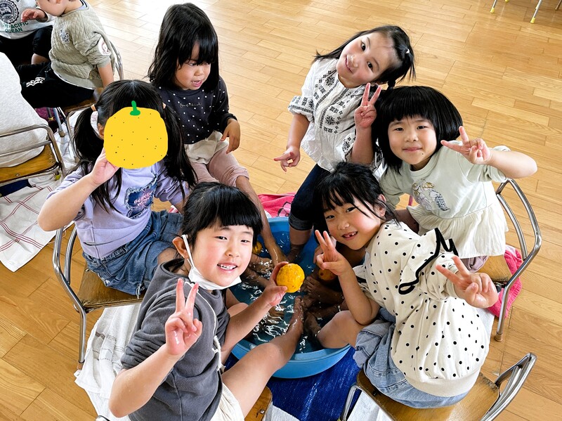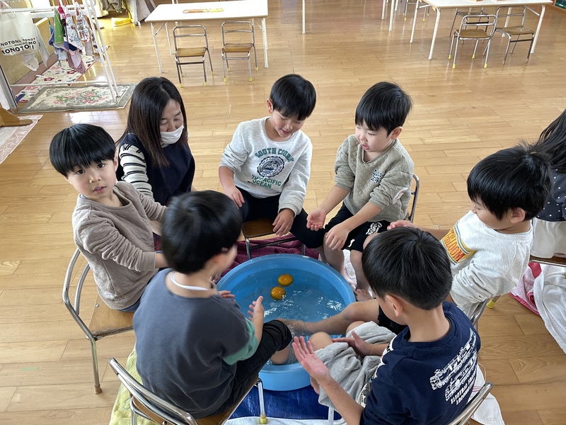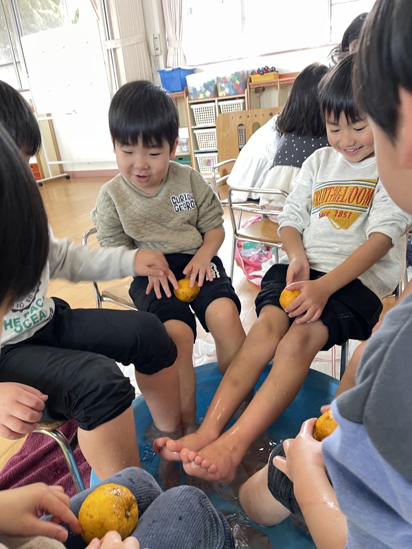 今日は冬至です。年長組さんに冬至についてのお話をした後にみんなでゆず湯の足湯をしました(^▽^)