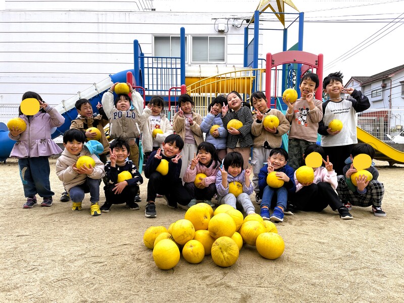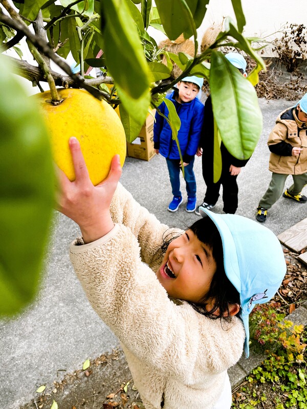 粉雪が舞ってとても寒い日でしたが、園舎裏にある木に実った晩白柚(ばんぺいゆ)を年長さんみんなで収穫しました(^▽^)/
