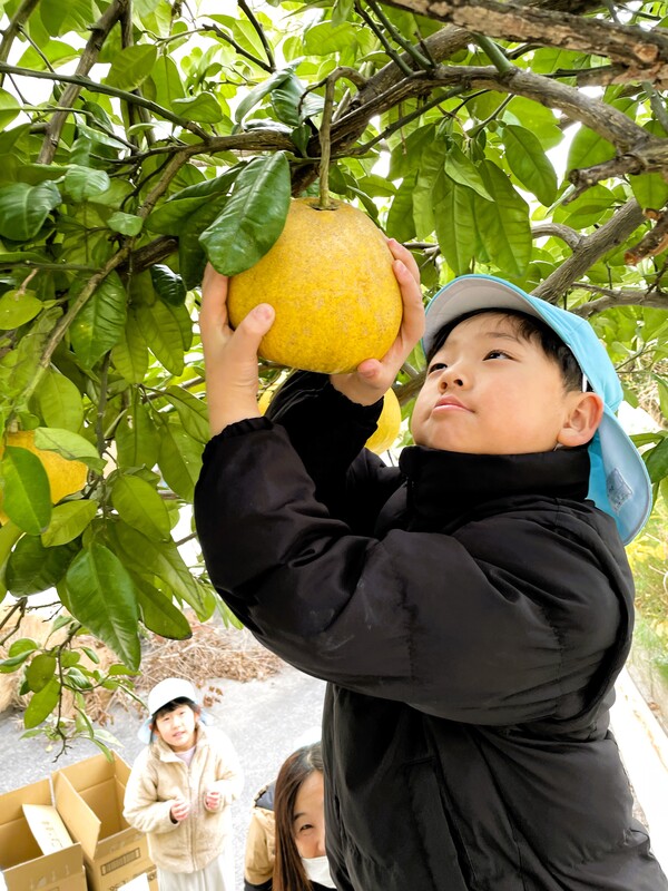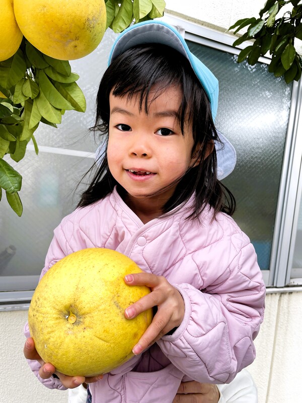 おおきくて重たい晩白柚(ばんぺいゆ)にびっくりしながら頑張って収穫をしました。『いい匂い~♪』と採れたての晩白柚の香りを楽しんでいました☆